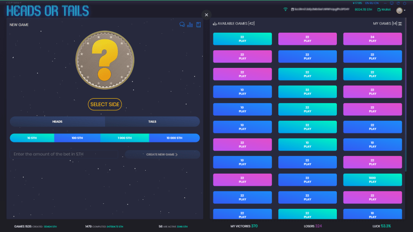 “Heads or Tails” is a multiplayer game, based on the DPOS blockchain with instant payments, built-in wallet and exchange platform for popular cryptocurrencies. Statistics of your games and a chat are also available.