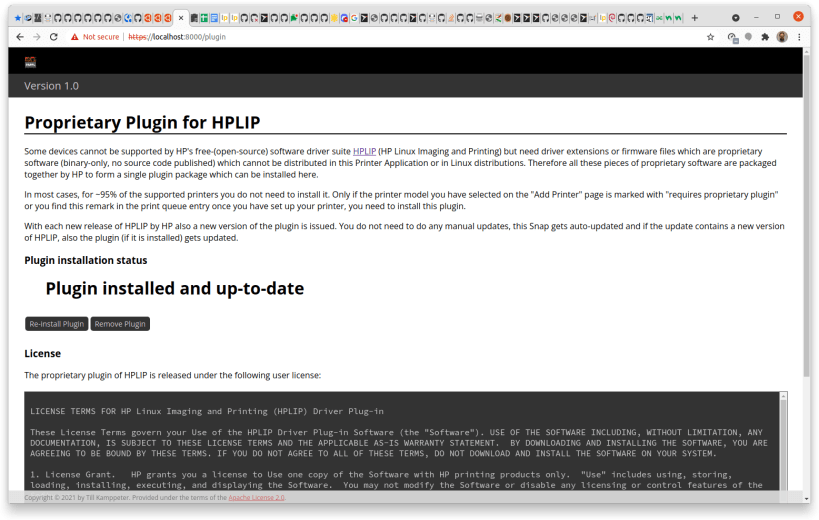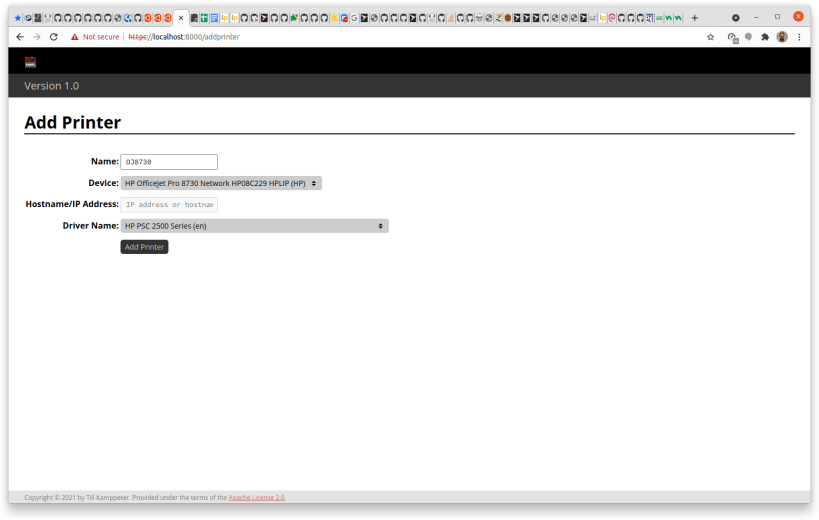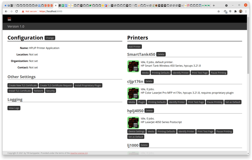 , ... if you have more than one Printer Application installed), click "Add Printer". Detailed instructions: https://github.com/OpenPrinting/hplip-printer-app#installing-and-building