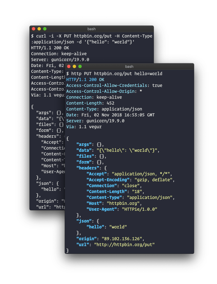 HTTPie aitch-tee-tee-pie is a user-friendly command-line HTTP client for the API era. It comes with JSON support, syntax highlighting, persistent sessions, wget-like downloads, plugins, and more.