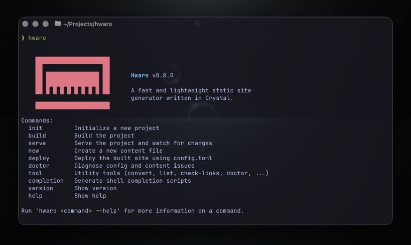 Hwaro (화로) is a lightweight and fast static site generator written in Crystal. It provides a flexible, extensible architecture for building static websites with support for markdown content, templates, SEO features, and lifecycle hooks.