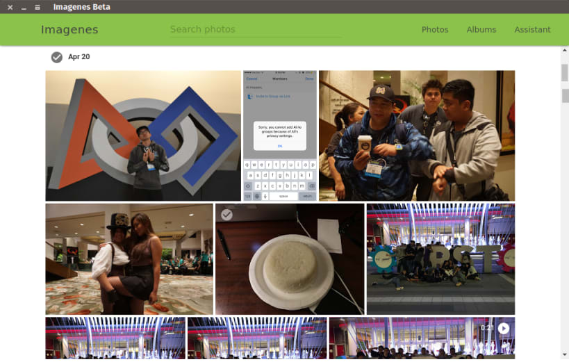 Imagenes is an Electron app to give users access to Google Photos without the need of opening up the Chrome browser first. It offers quick access to the Photos Assistant, Albums, search, and photo library.