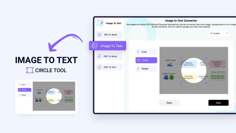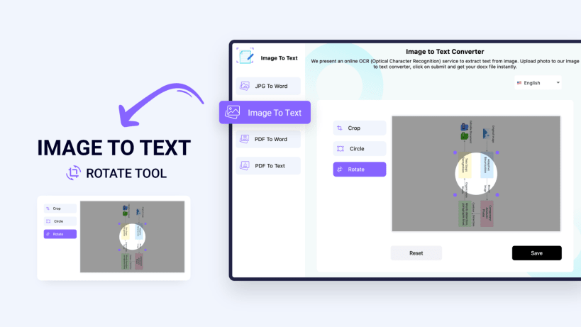 Before finalizing the image, you can crop it in a rectangular or circular shape, and you can also rotate it. If you have an image in the horizontal orientation that you want to get in the vertical orientation (or vice versa), you can adjust it right within the converter rather than using an actual editor. Similarly, if you only want to convert a certain portion of an image into the editable text format, you can use the cropping feature to adjust it as well.
