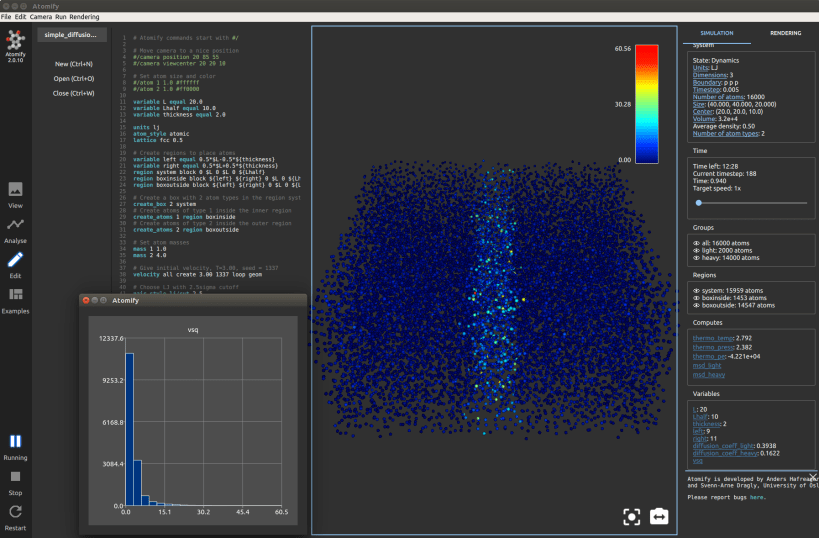 Atomify LAMMPS is an easy-to-use visualizer and editor for the molecular dynamics simulator LAMMPS. Atomify supports OpenMP acceleration, live plotting of LAMMPS variables and computes, and an easy to use code editor in one single program. The latter utilizes the powerful machinery already built into LAMMPS to allow easy access to advanced physical quantities. Atomify is open source software written in C++ built on top of Qt.