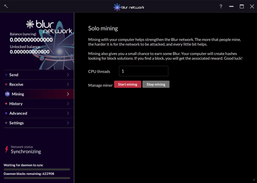 Users can mine BLUR with a single click using this package. Other features include sending, receiving, and more.