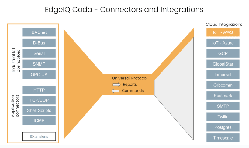 EdgeIQ Coda is a powerful service designed to connect, manage, and orchestrate IoT devices at the edge. It supports a wide range of industrial protocols (Modbus, BacNET, OPC-UA) and application protocols (Serial, D-Bus, SNMP, HTTP, TCP/UDP, etc.), and can be integrated with numerous cloud services (AWS IoT Core, Azure IoT Hub, GCP, Inmarsat, Orbcomm, Twilio, etc.), providing flexible workflows for IoT device orchestration.
