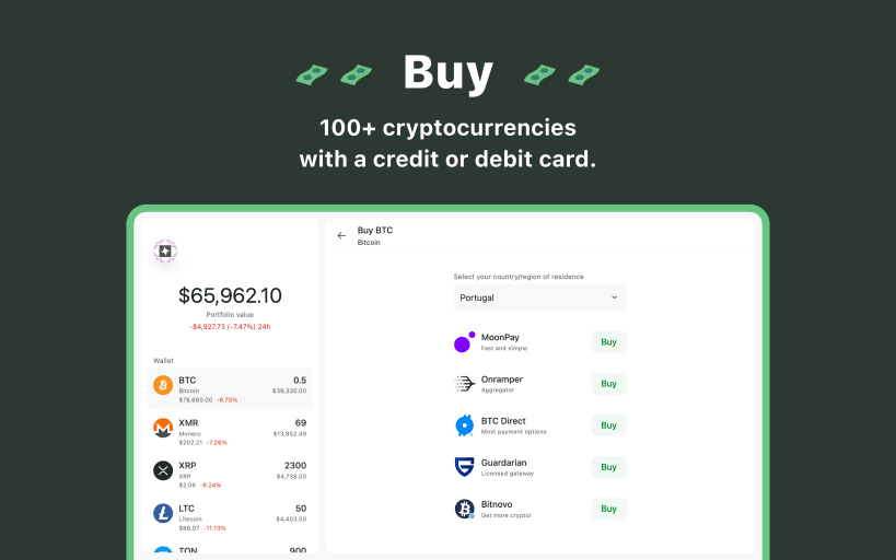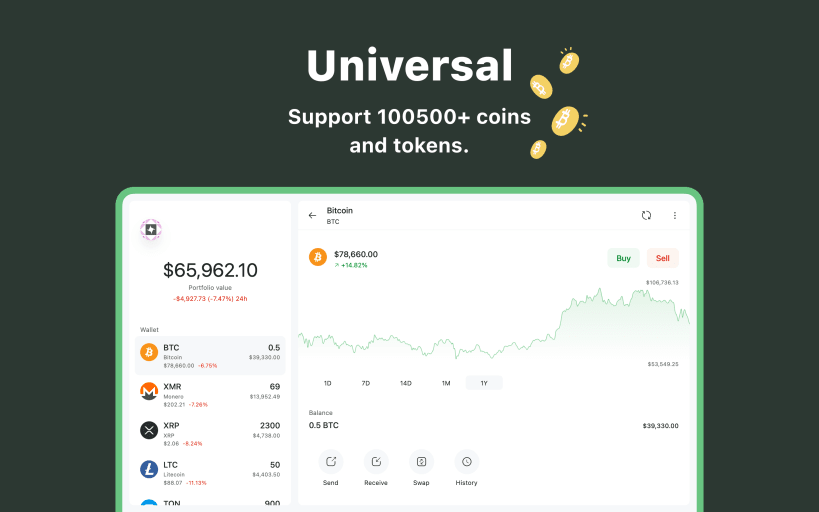 Use your Coin Wallet to easily buy, sell, and swap Bitcoin (BTC), Bitcoin cash (BCH), Ethereum (ETH), Ethereum Classic (ETC), Solana (SOL), Litecoin (LTC), Dogecoin (DOGE), Dash (DASH), Ripple (XRP), Stellar (XLM), EOS, Monero (XMR), Binance Smart Chain (BNB), Avalanche (AVAX), Cardano (ADA), Polygon (MATIC), TRON (TRX), Arbitrum One (ARB), Toncoin (TON), Optimism (OP), Fantom (FTM), Sui (SUI), Base (ETH), Sonic (S), and over 2000 ERC20, BEP20, ARC20, TRC20, SPL, Polygon, Arbitrum, Optimism, Sui, Base, Sonic tokens or DeFi tokens!