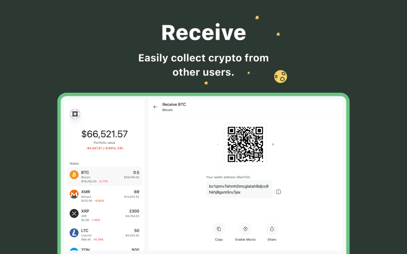 Get started in seconds on our user-friendly cryptocurrency wallet app! No registration or sign ups required to start your bitcoin wallet. Easily swap, sell, hold or buy bitcoin BTC, BCH, ETH, ETC, SOL, BNB, XRP, DASH, LTC, DOGE, XMR, ADA, MATIC, TRX, ARB, TON, OP, FTM, SUI, S, and other cryptocurrency. Using our wallet app, you can also access Web 3 Decentralized Applications (DApps) powered by Ethereum and Binance Smart Chain smart contracts!