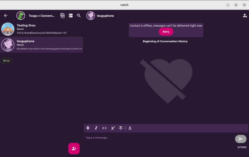 Cwtch (/kʊtʃ/ - a Welsh word roughly translating to “a hug that creates a safe place”) is a decentralized, privacy-preserving, multi-party messaging protocol that can be used to build metadata resistant applications.