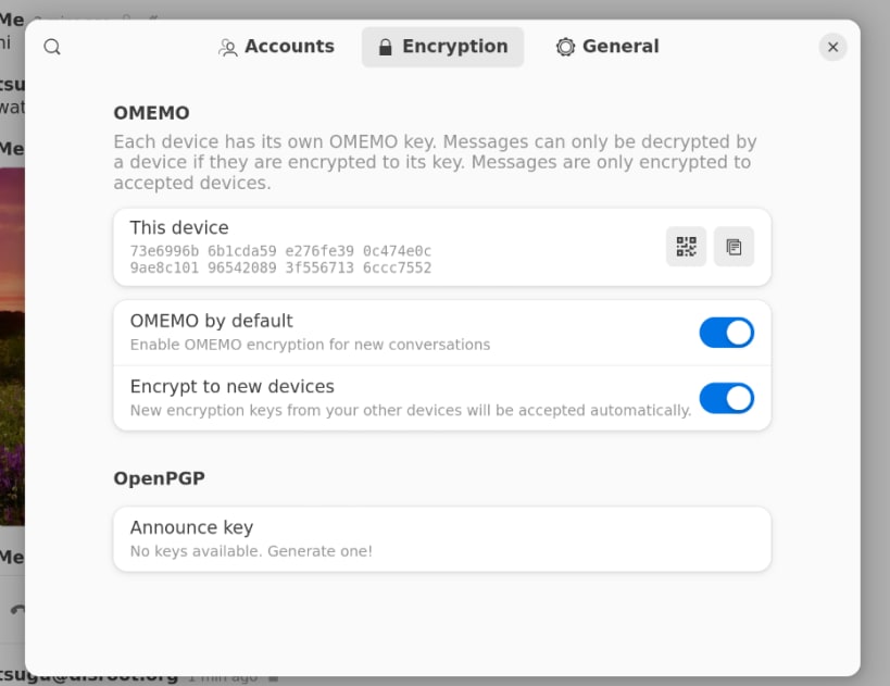 It supports end-to-end encryption with OMEMO and OpenPGP and allows configuring privacy-related features such as read receipts and typing notifications.