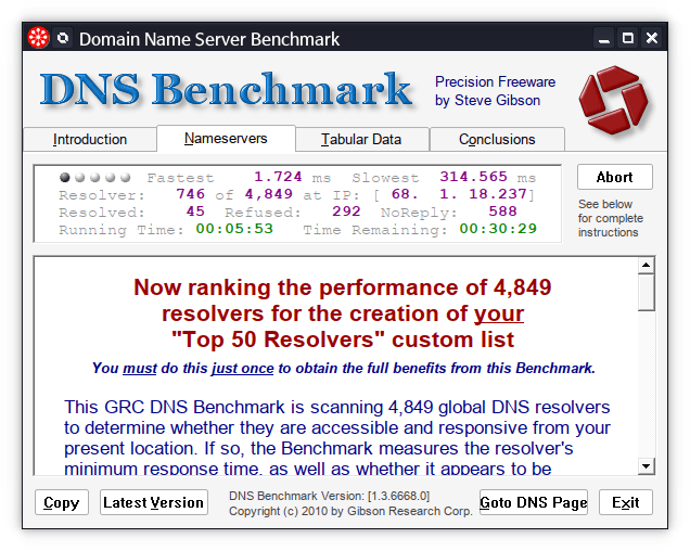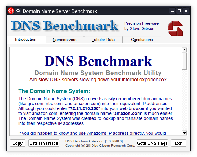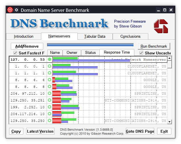 GRC's DNS Benchmark performs a detailed analysis and comparison of the operational performance and reliability of any set of up to 200 DNS nameservers (sometimes also called resolvers) at once. When the Benchmark is started in its default configuration, it identifies all DNS nameservers the user's system is currently configured to use and adds them to its built-in list of publicly available “alternative” nameservers. Each DNS nameserver in the benchmark list is carefully “characterized” to determine its suitability — to you — for your use as a DNS resolver. This characterization includes testing each nameserver for its “redirection” behavior: whether it returns an error for a bad domain request, or redirects a user's web browser to a commercial marketing-oriented page. While such behavior may be acceptable to some users, others may find this objectionable.