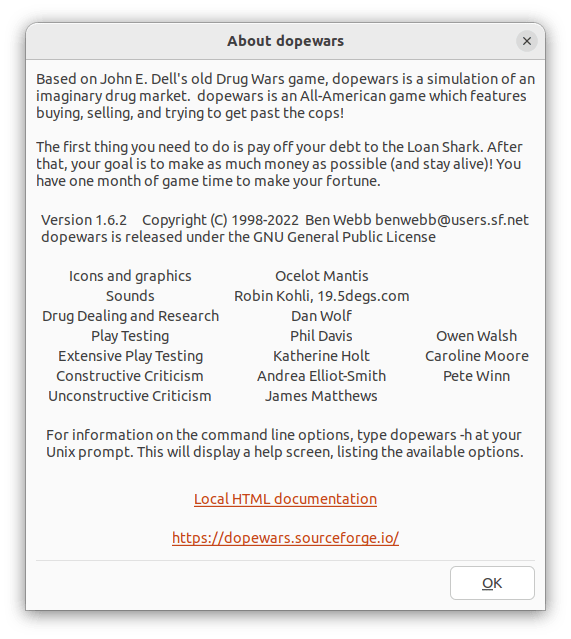 Dopewars is a free Unix/Win32 rewrite of a game originally based on "Drug Wars" by John E. Dell. The idea of dopewars is to deal in drugs on the streets of New York, amassing a huge fortune and paying off the loan shark, while avoiding the ever-annoying police. The Unix/Win32 rewrite, as well as featuring a so-called "antique" mode which closely follows the original, introduces new features such as the ability to take part in multi-player games. dopewars aims to be highly configurable, and what you can't change in the configuration files you can change by poking around in the source, which is freely available under the terms of the GNU General Public License.
