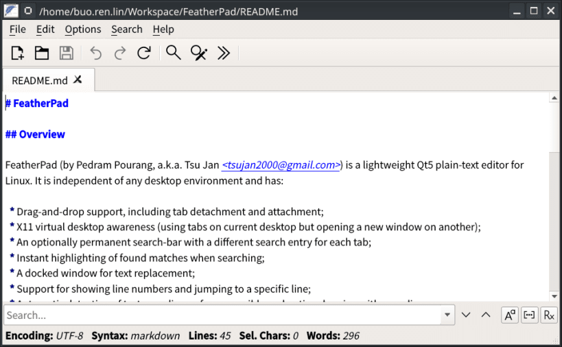 FeatherPad (by Pedram Pourang, a.k.a. Tsu Jan tsujan2000@gmail.com) is a lightweight Qt5 plain-text editor for Linux. It is independent of any desktop environment and has: