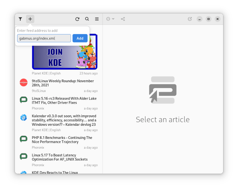 Feeds is a minimal RSS/Atom feed reader built with speed and simplicity in mind.