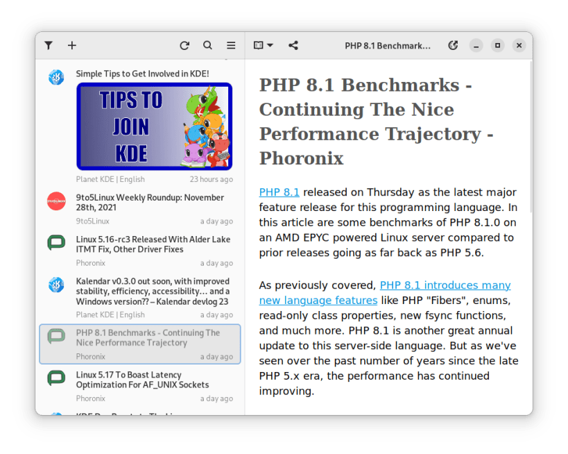 Articles are shown in a web view by default, with javascript disabled for a faster and less intrusive user experience. There's also a reader mode included, built from the one GNOME Web/Epiphany uses.
