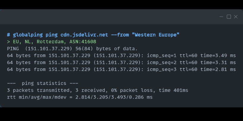 Globalping is a free and open source CLI tool that allows everyone to run commands like ping, traceroute, mtr, DNS resolve (dig), HTTP (curl) from community hosted probes all around the world.