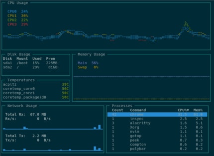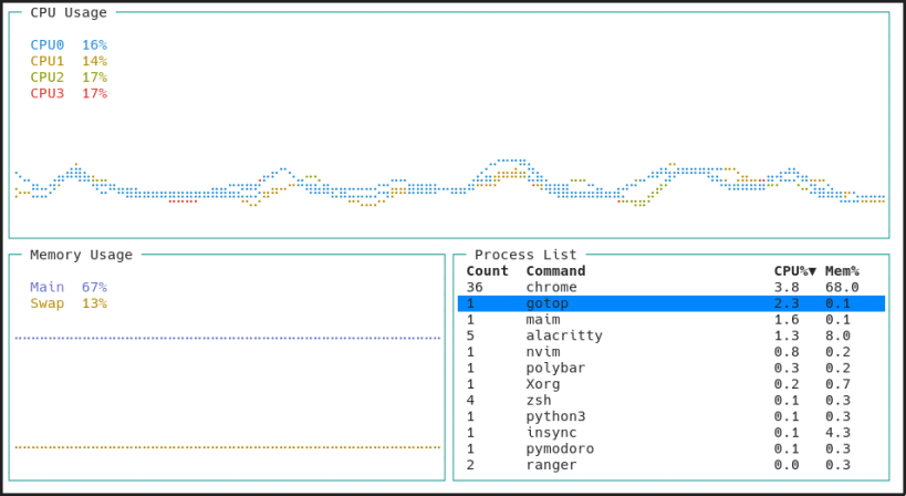 Another terminal based graphical activity monitor, inspired by [gtop](https://github.com/aksakalli/gtop) and [vtop](https://github.com/MrRio/vtop), this time written in [Go](https://golang.org/)!