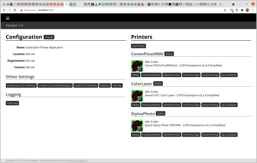 The Gutenprint Printer Application is a PAPPL (Printer Application Framework) based Printer Application to support printers using the Gutenprint printer driver.