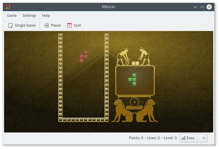 KBlocks is the classic falling blocks game. The idea is to stack the falling blocks to create horizontal lines without any gaps. When a line is completed it is removed, and more space is available in the play area. When there is not enough space for blocks to fall, the game is over.