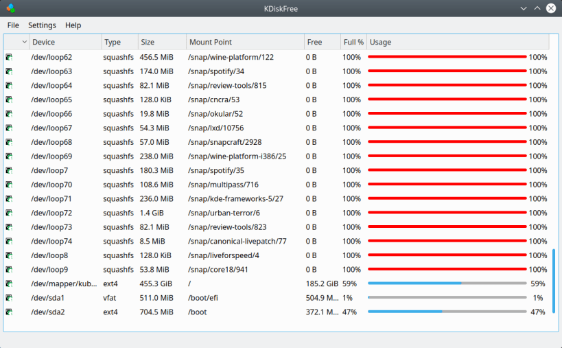 KDiskFree displays information about hard disks and other storage devices, including the amount of free space available. It can also mount and unmount storage devices and view them in the file manager. . KwikDisk is an icon for the system tray that provides convenient access to the features of KDiskFree.