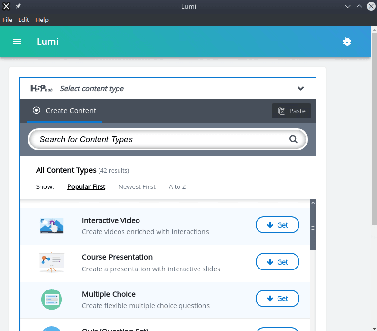 With Lumi you can create, edit and view interactive HTML elements (H5P packages) in your desktop environment. You can choose from over 40 content types (templates), which include interactive videos and all common quiz types such as fill-in-the-blanks, multiple choice questions. You don't need any programming knowledge to work with Lumi!