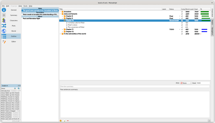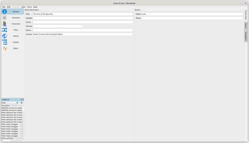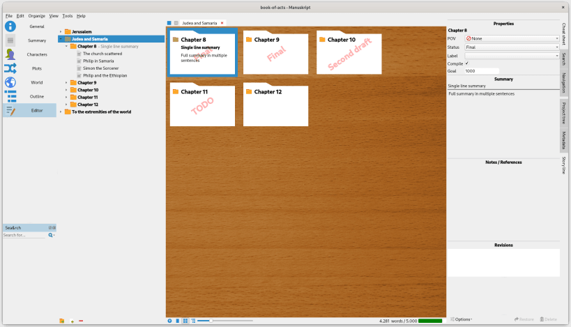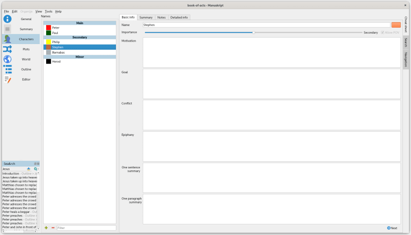 Manuskript provides a rich environment to help writers create their first draft and then further refine and edit their masterpiece. With Manuskript you can: