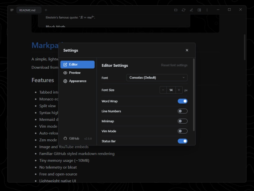 A lightweight, minimalist Markdown viewer and text editor built for productivity across Windows, macOS, and Linux. Features: