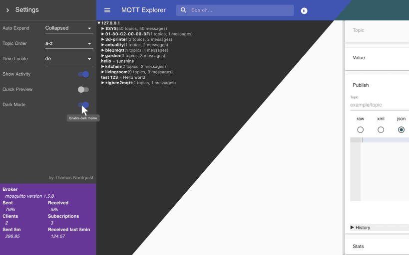 See the whole picture of your message queue. The perfect tool to integrate new services, IoT devices in your network. This application subscribes to all topics on your MQTT-Server and displays your message queue hierarchy, allowing you to drill-down to the topics that are of interest.