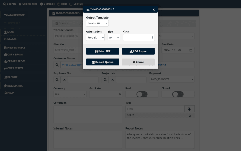 The Nervatura Client is a server-side responsive component application. It was created so that all the business data of the framework can be managed immediately after installation through a graphical interface. The client and report interface supports multilingualism.