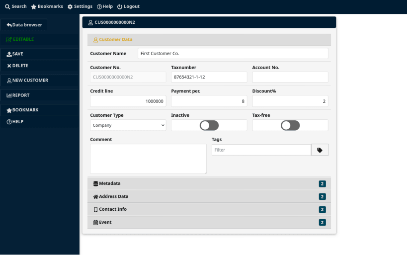 Nervatura is a business management framework. It can handle any type of business related information, starting from customer details, up to shipping, stock or payment information.