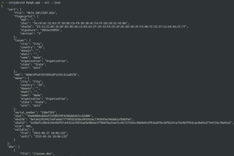 ninjadroid ~/path/to/MyApk.apkninjadroid ~/path/to/MyApk.apk --allninjadroid ~/path/to/MyApk.apk --all --jsonninjadroid ~/path/to/MyApk.apk --all --extract ~/path/to/output/NOTE: The -e/--extract option is currently supported only in devmode, that is by installing the snap using the --devmode option.