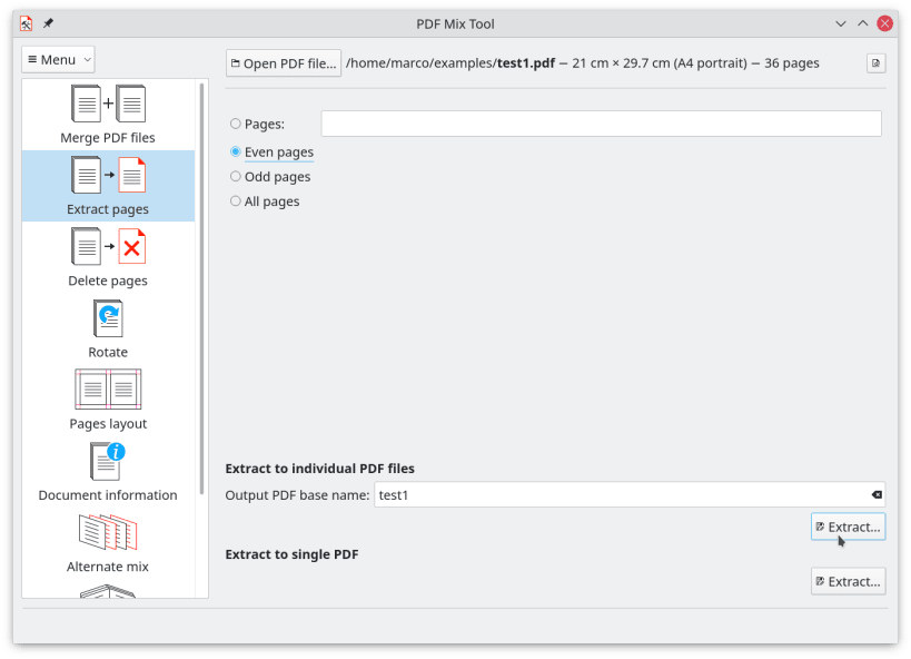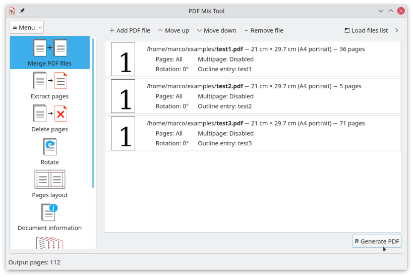 Besides, it can also mix files alternating their pages, generate booklets, add white pages to a PDF file, delete pages from a PDF file, extract pages from a PDF file, edit the PDF document information.
