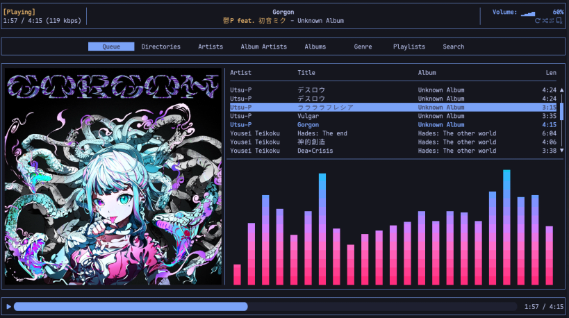 Rmpc is a beautiful, modern and configurable terminal based Music Player Daemon client. It was inspired by ncmpcpp and aims to provide an alternative with support for album art through kitty image protocol without any ugly hacks. It also features ranger/lf inspired browsing of songs and other goodies. Written by Mierak on Github.
