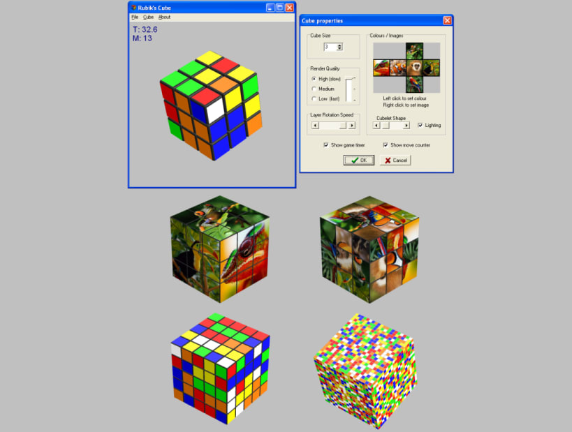 Rubix is a 3D rubik's cube simulator that allows you to solve a range of cube sizes from 2x2x2 to 50x50x50. There are several options that let you change the size of the cube, the colours of the faces or even add images to the faces. You can save a partially solved cubed to be continued at a later time.