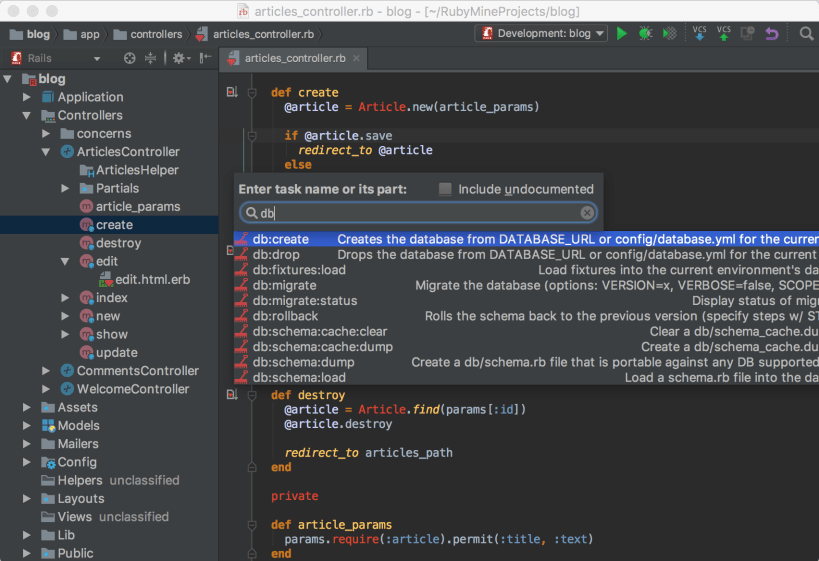 RubyMine is a dedicated Ruby and Rails development environment. The IDE provides a wide range of essential tools for Ruby developers, tightly integrated together to create a convenient environment for productive Ruby development and Web development with Ruby on Rails.