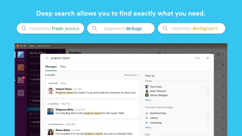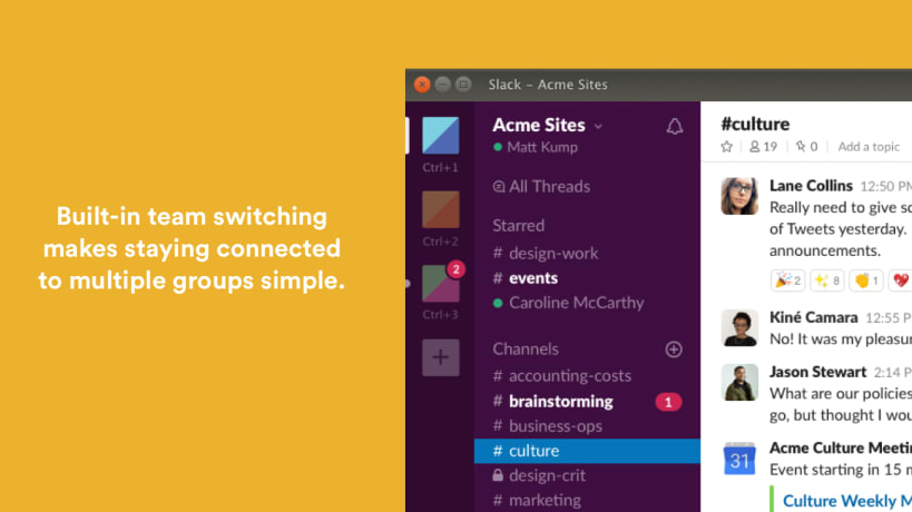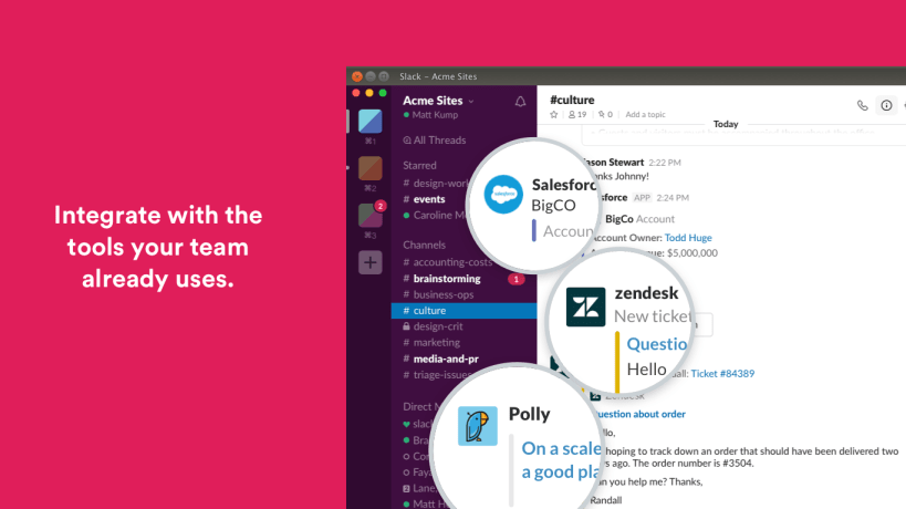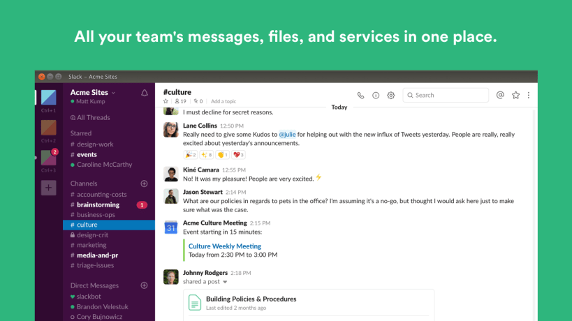 Slack brings team communication and collaboration into one place so you can get more work done, whether you belong to a large enterprise or a small business. Check off your to-do list and move your projects forward by bringing the right people, conversations, tools, and information you need together. Slack is available on any device, so you can find and access your team and your work, whether you’re at your desk or on the go.