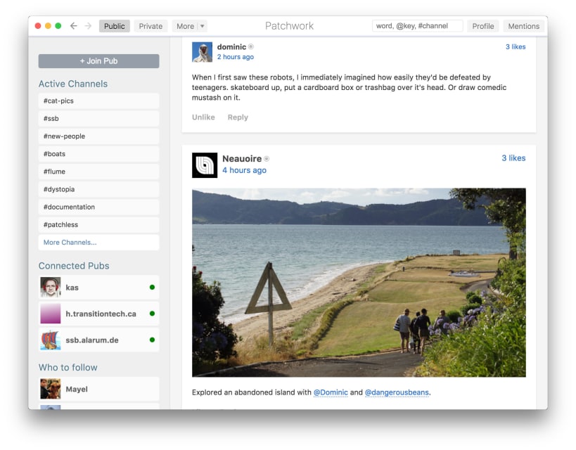 Connect with friends without depending on any central servers. Don't worry about spam, you only get messages from people you follow. Use Patchwork online or offline, the data you need is stored on your device. Sync messages with friends when you're on the same Wi-Fi network. Keep secrets with private messages, which are always end-to-end encrypted. Change and improve Patchwork however you'd like, it's free and open source.