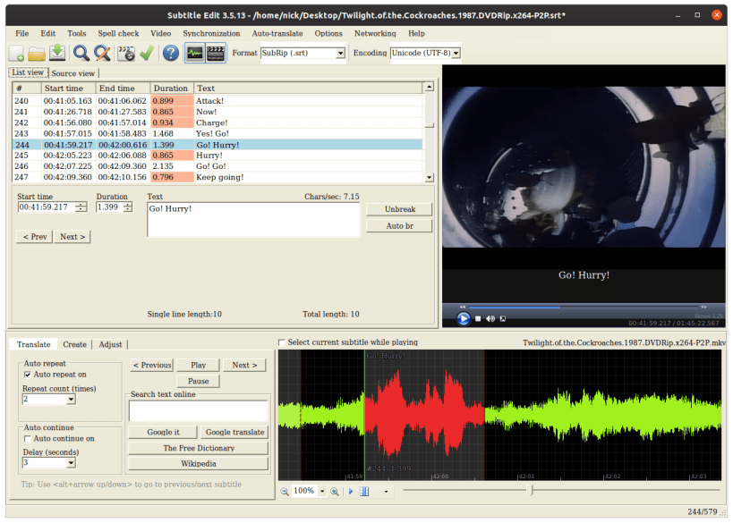 Subtitle Edit is a free (open source) editor for video subtitles - a subtitle editor :) With SE you can easily adjust a subtitle if it is out of sync with the video in several different ways. You can also use SE for making new subtitles from scratch (do use the time-line/waveform/spectrogram) or translating subtitles.