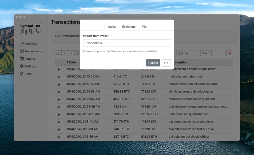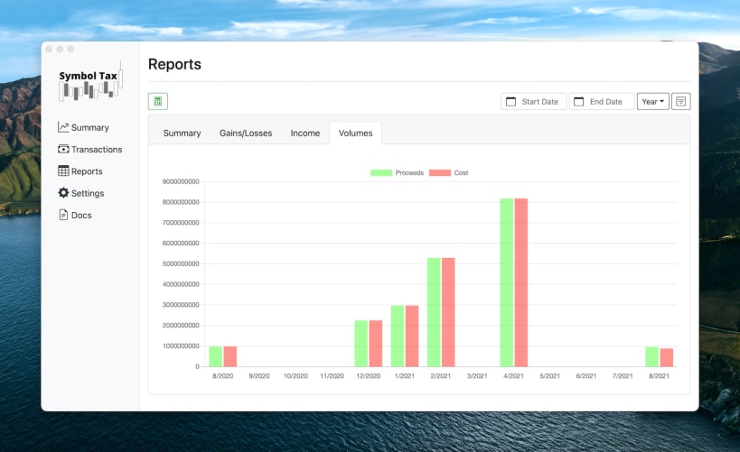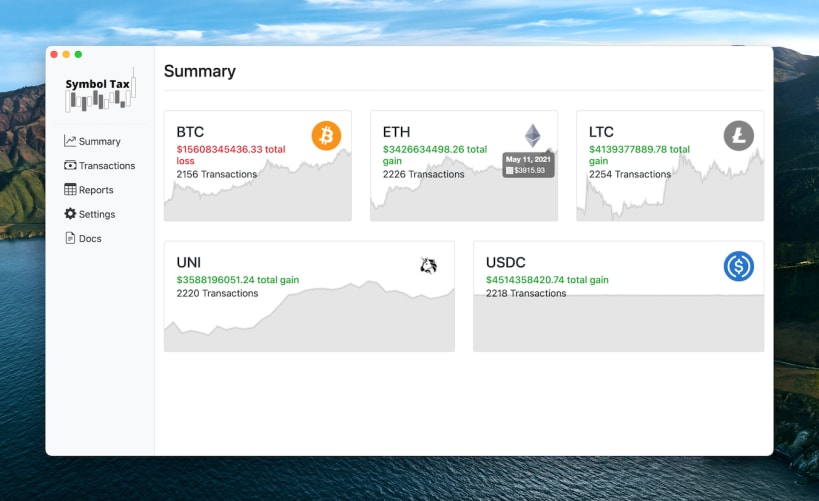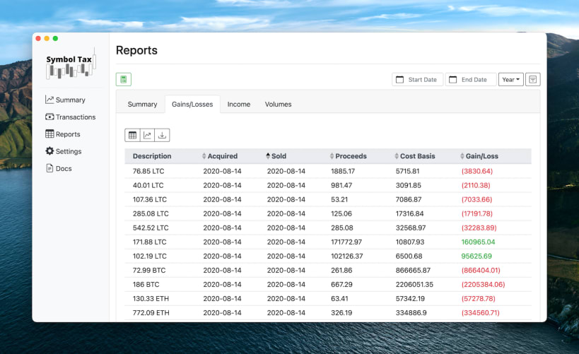 Symbol Tax is crypto tax software for calculating capital gains/losses tax and for various cryptocurrency symbols and DeFi transactions. It has the capability to download symbol price data and calculate/update your capital gains/losses as well as keep track of both your short and long term capital gains.