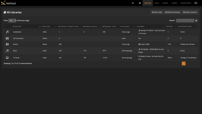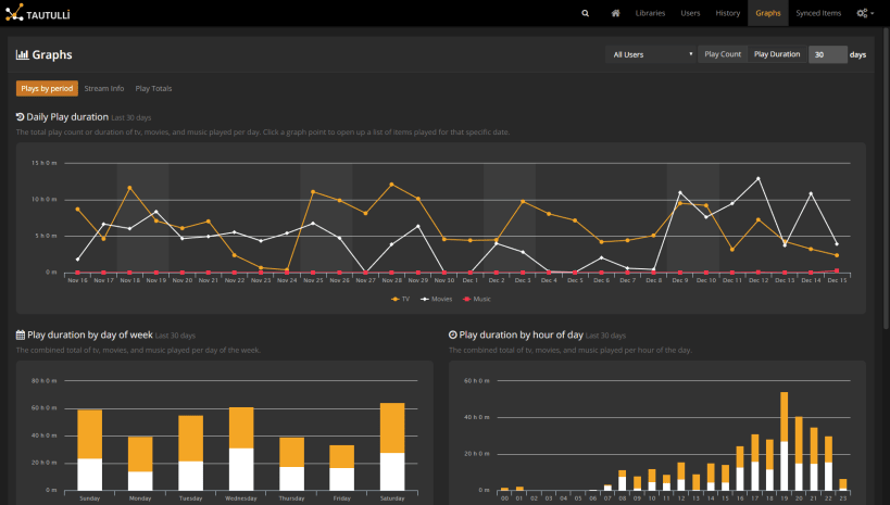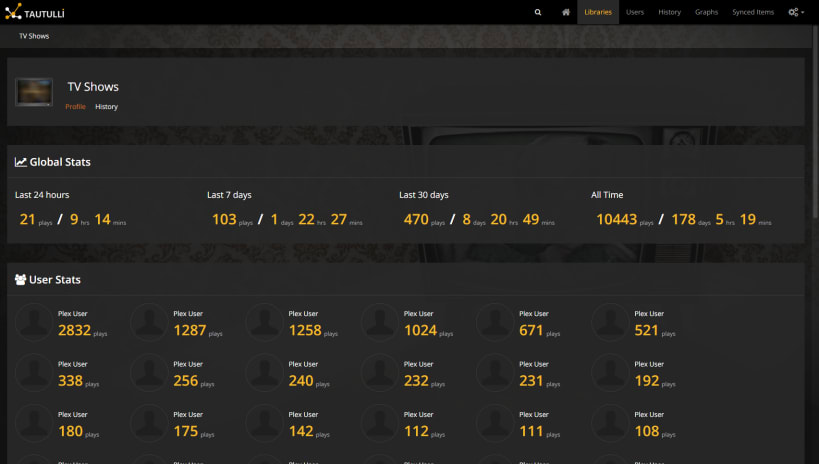 Tautulli is a 3rd party application that you can run alongside your Plex Media Server to monitor activity and track various statistics. Most importantly, these statistics include what has been watched, who watched it, when and where they watched it, and how it was watched. The only thing missing is "why they watched it", but who am I to question your 42 plays of Frozen. All statistics are presented in a nice and clean interface with many tables and graphs, which makes it easy to brag about your server to everyone else.