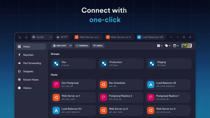 Termius is an SSH client and terminal how it should be. Connect with one tap from any mobile and desktop device—no re-entering IP addresses, ports, and passwords.
