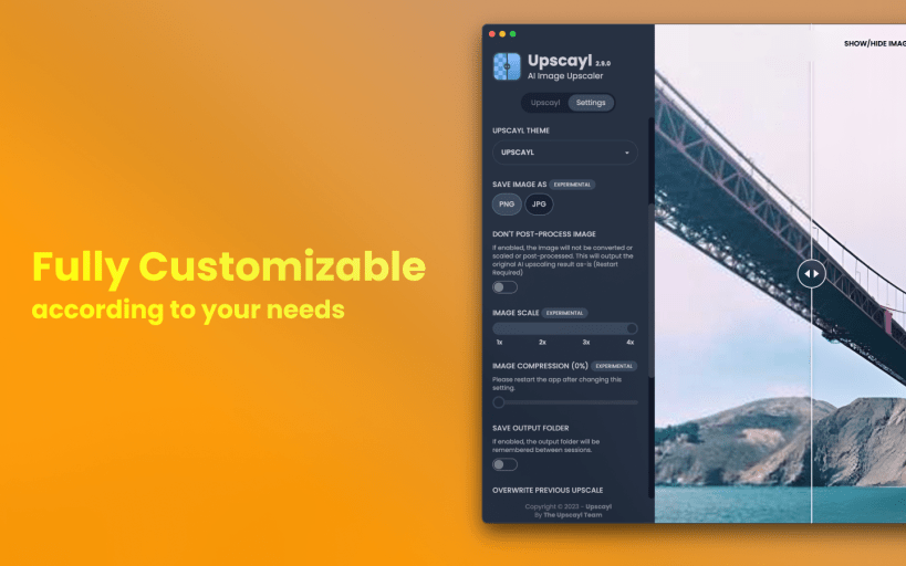 8. Customization Options: Tailor your image upscaling preferences with customizable settings, allowing you to adjust parameters according to your specific requirements.