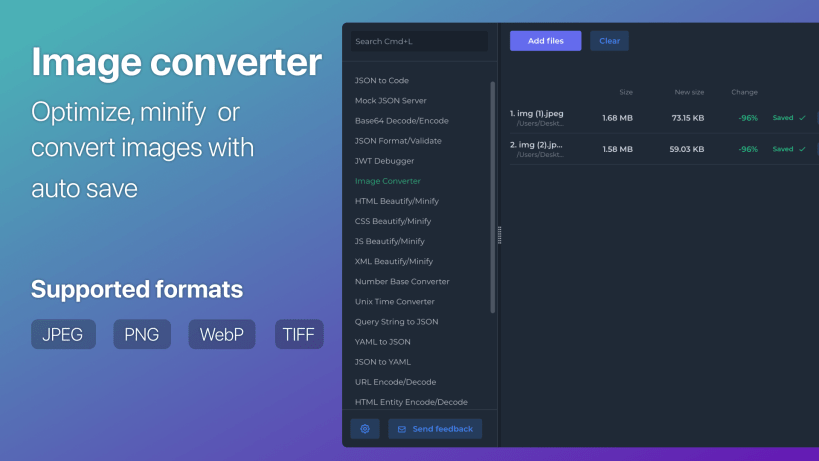 New tools: Image Converter - minify or convert images to JPEG, PNG, WebP, or TIFF