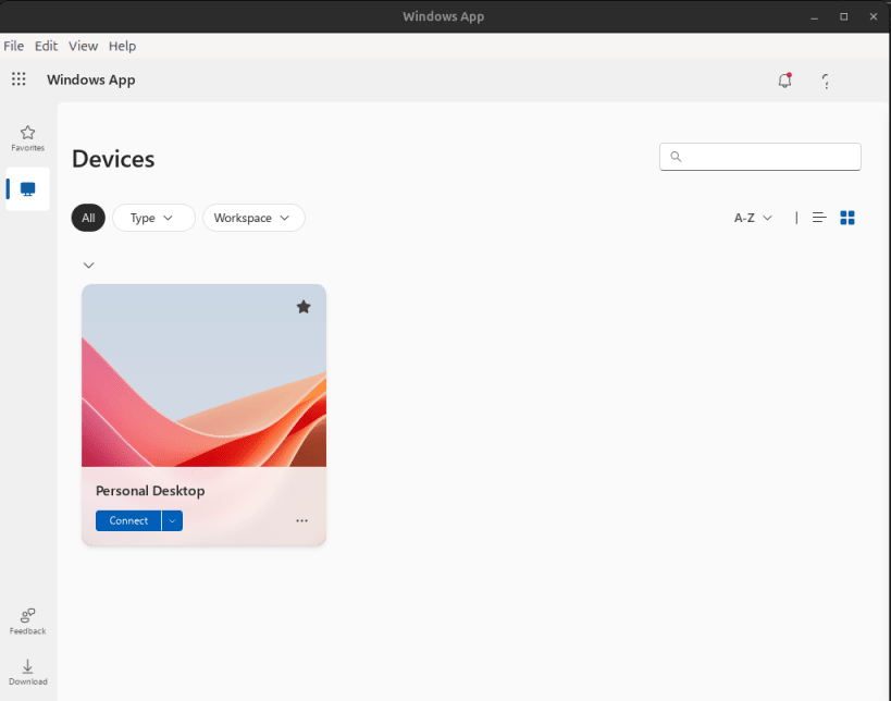 This unofficial client wraps the Windows Cloud Devices (Windows App) web interface in an Electron shell, configured to behave like the Microsoft Edge browser. It enables full access to Azure Virtual Desktop sessions through Windows App web access, with proper handling of camera, microphone, and other device permissions required for remote desktop connections.