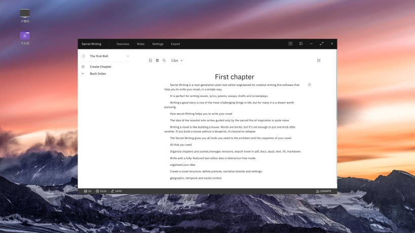 Secret Writing is a next-generation plain text editor engineered for creative writing,this software that help you to write your novel, in a simple way.