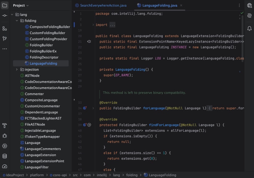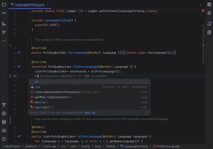 IntelliJ IDEA is a JetBrains IDE for professional development in Java and Kotlin. It unlocks productive development and helps you write high-quality code with ease. Built to get the job done, it provides all of the essential tools and cutting-edge technology support you need. With a smooth, comfortable workflow and a strong focus on privacy and security, IntelliJ IDEA lets you code with confidence and pleasure.