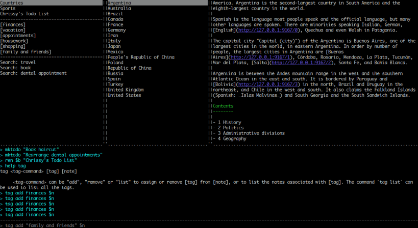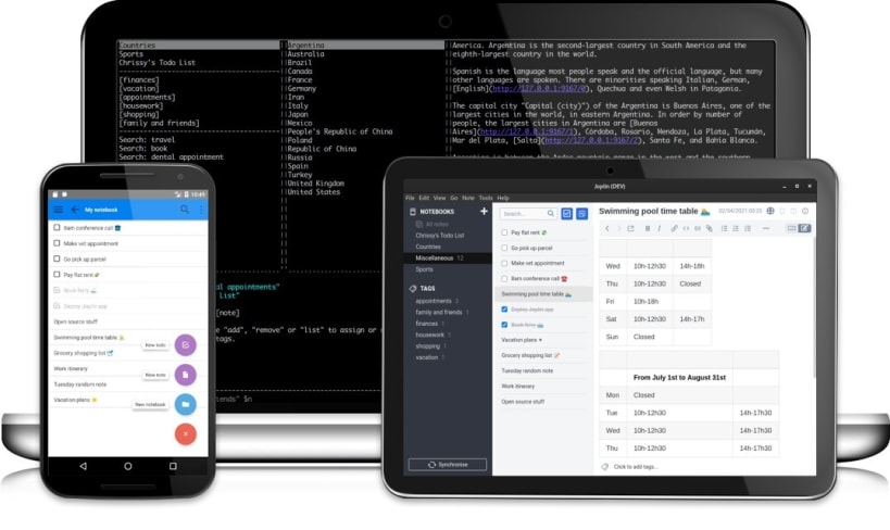 Joplin is a free, open source note taking and to-do application, which can handle a large number of notes organised into notebooks. The notes are searchable, can be copied, tagged and modified either from a text editor (the snap includes neovim and nano only). The notes are in Markdown format. The notes can be synchronised with various cloud services including Nextcloud, Dropbox, OneDrive, WebDAV or the file system (for example with a network directory). When synchronising the notes, notebooks, tags and other metadata are saved to plain text files which can be easily inspected, backed up and moved around.