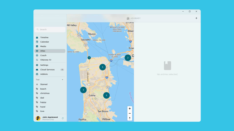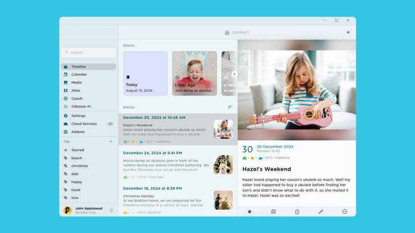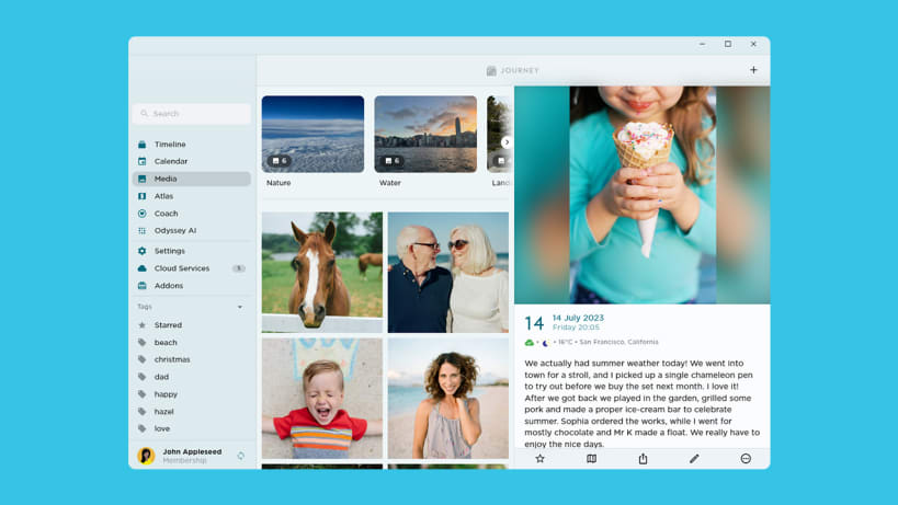 Chat with Your Journal in Odyssey AI^: Odyssey AI enhances your journaling with AI-powered suggestions, meaningful insights, and the ability to chat about trends, questions, and your photos.