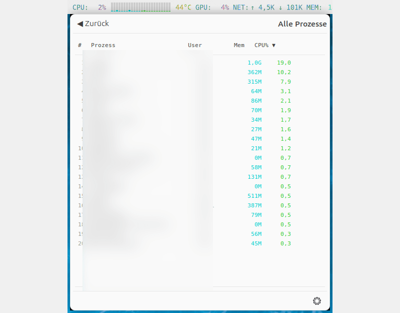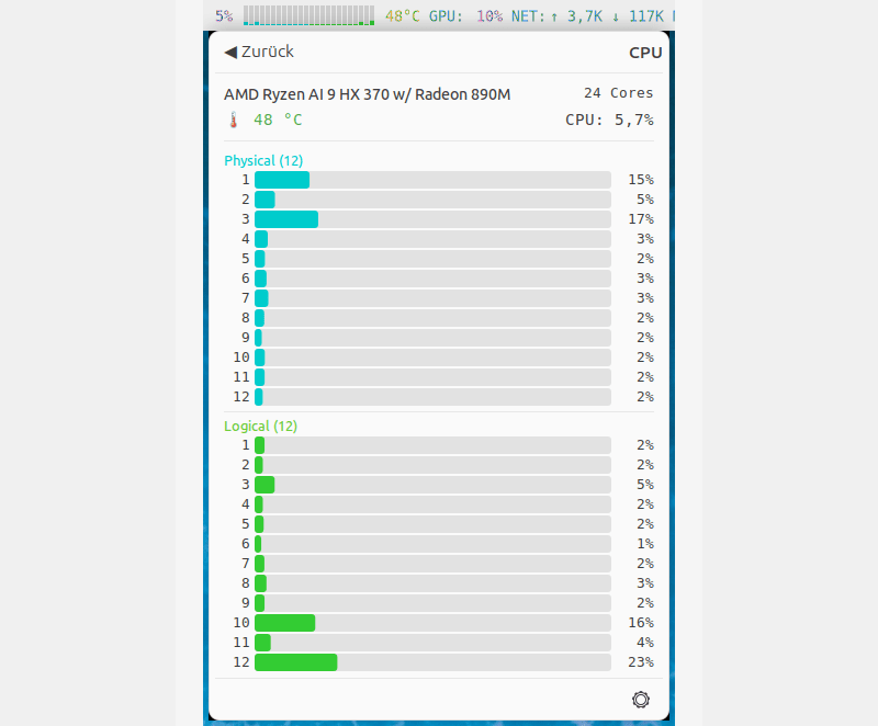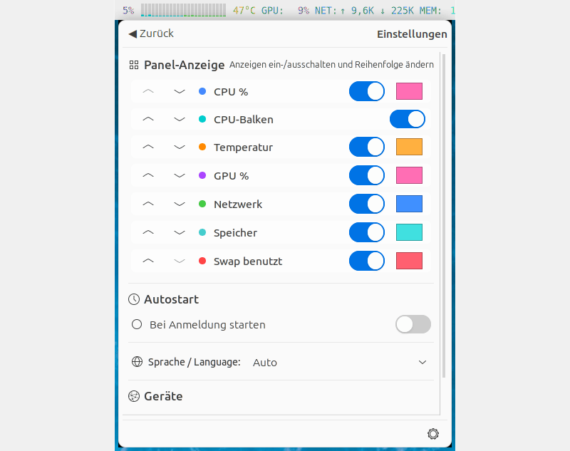Shows CPU, GPU, temperature, network speed, memory and swap in the system tray with colored text and mini CPU core bars.