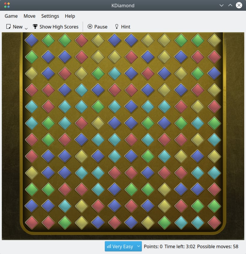 KDiamond is a three-in-a-row game like Bejeweled. It features unlimited fun with randomly generated games and five difficulty levels with varying number of diamond colors and board sizes.