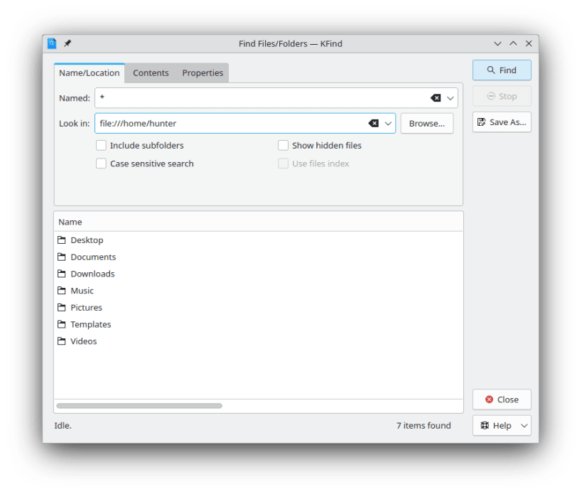 KFind can be used as a standalone search tool, launched by KRunner or from your menu. It is also integrated into Dolphin as "Open KFind" in the "Tools" menu. It allows you to find files by name, type or content.